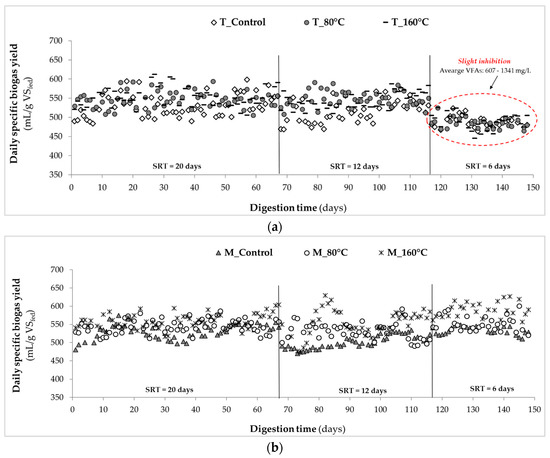 The evolution of thermophilic and mesophilic anaerobic digesters’ biogas production through the operating periods (during steady-state) is presented in Figure 3. The average daily specific biogas yields of digesters were in the range of 485–552 and 501–590 mL/g VSfed, respectively, under thermophilic and mesophilic temperatures. The biogas production was slightly higher in mesophilic digesters compared to thermophilic ones; however, neither operating temperature nor SRT had a significant effect on the biogas composition (p-value > 0.05). Throughout the AD operation, the average CH4 and CO2 contents in all digesters′ headspace were 68 ± 2 and 30 ± 2%, respectively. At SRTs of 20 and 12 days, MW-pretreated advanced digesters achieved higher biogas yields (~15%) under both operating temperatures compared to the respective controls. As the SRT was decreased to 6 days, the highest biogas generation was obtained from the advanced digester of “M_160 °C” (590 ± 23 mL/g VSfed; p-value = 0.000 < 0.05) compared to the digester of “M_Control” (532 ± 13 mL/g VSfed), as shown in the Figure 3b. On the other hand, a slight decrease in biogas production to 488 ± 17 mL/g VSfed was observed in the thermophilic digesters at the 6-day SRT (Figure 3a), which is most likely due to the accumulation of volatile fatty acids (VFAs: up to 1341 ± 297 mg/L) under thermophilic conditions at high OLRs. Increased VFAs concentrations within the digesters can be explained by the fact that there was enough time only for the completion of hydrolysis, acidogenesis, and acetogenesis steps, but not adequate time for the completion of methanogenesis. The inhibition behavior observed from thermophilic systems are in agreement with literature reporting on reduced microbial diversity and therefore less stable AD operation under high OLRs and/or when utilizing by-products of high intensity pretreatment at elevated digester temperatures [54,55].
