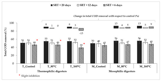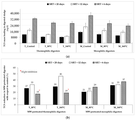 Initially it was expected that improvements (%) in TCS removals in hybrid AD systems (MW + AD) compared to controls (AD) would increase as SRT was reduced from 20 days to 12 and 6 days as controls were expected to be challenged at shorter SRTs. However, in this study, when the SRT was reduced, TCS reduction obtained from the digesters increased at both mesophilic and thermophilic (except for “T_80 °C” and “T_160 °C” that experienced slight inhibition at the 6-day SRT) temperatures (Figure 6b). Aside from the MW irradiation affect, this can be explained by the higher accessibility of micropollutants in digested sludge matrix compared to digester feed sludge during extraction step of analytical analysis. In other words, micropollutants can be more accessible to quantification in digested sludge compared to that of in undigested sludge due to the alteration of organic matter quality and quantity during AD process (both in control and pretreated ADs). Consequently, as the extent (i.e., SRT) of digestion increased, concentrations of micropollutants (such as TCS levels in this study) in effluents from AD would increase due to higher detectability/quantification compared to that in effluents at shorter SRTs (i.e., 12 or 6 days), and resulting in reduced micropollutant reduction percentages for long SRTs, as previously reported for pharmaceuticals in sludge digesters [59].