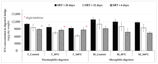 Average triclosan (TCS) concentrations in anaerobically digested sludge obtained from thermophilic and mesophilic digesters at sludge retention times (SRTs) of 20, 12, and 6 days during steady-state.