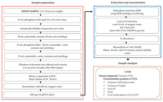 Flow chart for simultaneous detection and quantification of triclosan and its transformation products in sludge (adapted from U.S. EPA Method 1694 [61]).