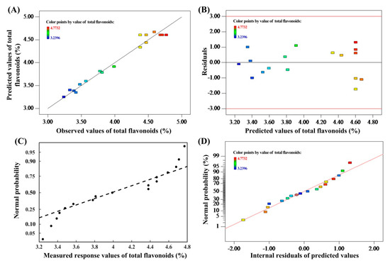 Plot of predicted vs observed values of the total flavonoids (A); the plot of the residuals versus the predicted response (B); the normal probability for the measured response values (C); Normal probability plots of residuals (D).