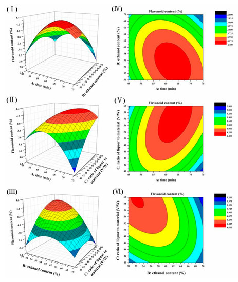 Response surface plots. (I–III) were showing the effects of extraction time (A), ethanol content (B), and (C) ratio of liquor to material on the content of total flavonoids, respectively. (IV–VI) were their contour plots, respectively.