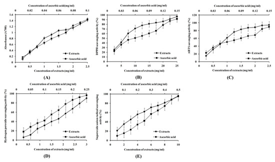 Moreover, DPPH reducing power, DPPH scavenging activity, the formation of the superoxide radical, hydrogen peroxide, and ABTS+ are the 5 most common antioxidant indices measured, in vitro [9]. In this study, as shown in Table 5 and Figure 3B–E, DPPH, ABTS+, hydrogen peroxide, and superoxide anion radical scavenging activities of SIFs and ascorbic acid were increased significantly with increasing concentrations. There were significant correlations between the scavenging activities and extract concentrations (multiple R were 0.935, 0.945, 0.995, and 0.989, respectively; p < 0.05). There were also significant correlations between the scavenging activities and ascorbic acid measurements (multiple R were 0.990, 0.984, 0.996, 0.997, respectively; p < 0.05). The EC50 of the extracts were 6.13, 0.88, 1.8, and 3.84 mg/mL, respectively, which was higher than the EC50 of ascorbic acid (0.063, 0.065, 0.11, and 0.27 mg/mL), respectively.