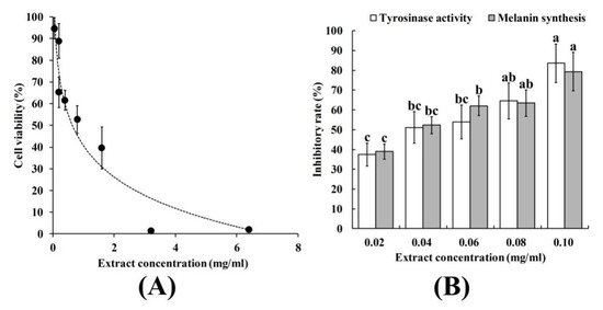 The effect of SIFs extract on cell activity (A) and inhibition rate of tyrosinase and melanin synthesis in melanoma cells A375 (B). Different small letters mean significant differences at p < 0.05.