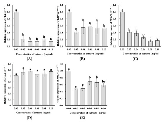 The effect of SIFs extract on relative expression of TYR (A), TYRP1 (B), TYRP2 (C), MCIR (D), and MITF (E) in melanoma cells A375.