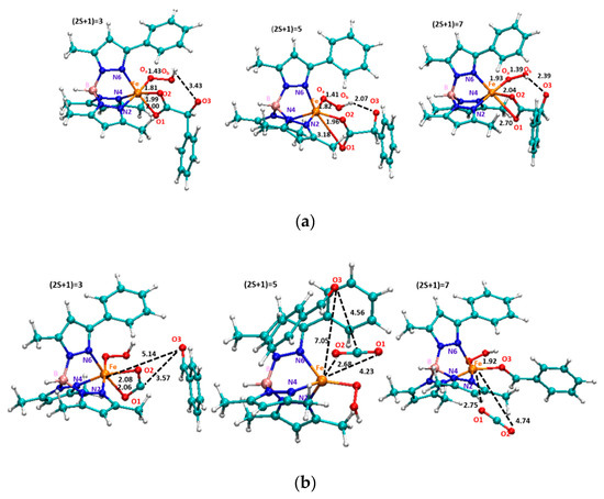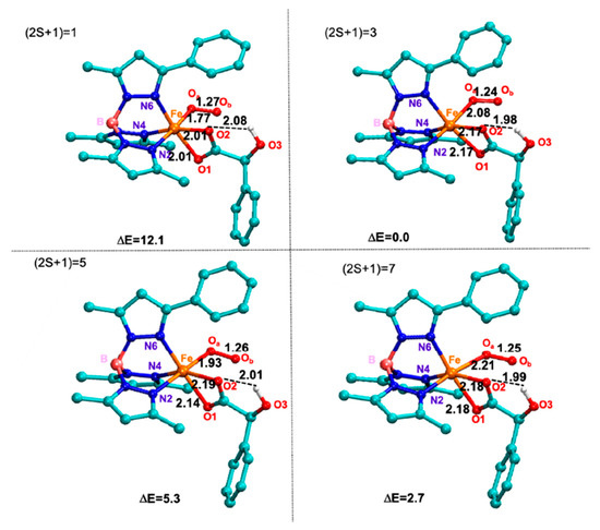 Paine et al. underline as “this iron(II) hydroperoxo species may also undergo O-O bond heterolysis to form an iron(IV)-oxo-hydroxo intermediate and both oxidant species can carry out the oxidation on different kind of substrates” [3]. To give a contribution to this aspect, geometry optimizations of the two forms have been performed and the resulting optimized geometries (shown in Figure S2) indicate that the quintet spin state proves to be the most stable one.