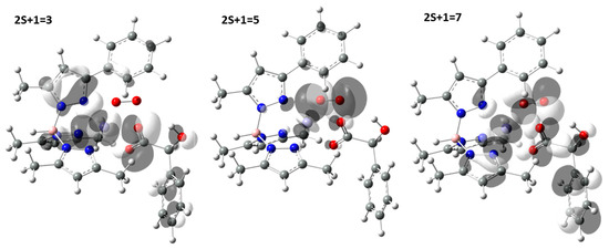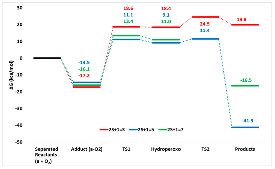 The addition of O2 molecule starting to the complex (a) leads to the formation of adducts that in all the three considered spin states lie below the reactants’ asymptote suggesting as their formation is an exergonic process (see Figure 4).