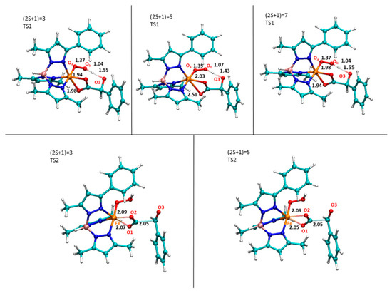 On the three computed potential energy surfaces, the first transition state (TS1) is located at 18.6 (triplet), 11.1 (quintet) and 13.4 (septet) kcal/mol and their corresponding optimized structures are shown in Figure 5.