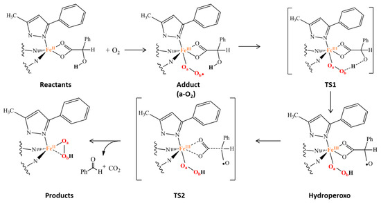 The considered reaction mechanism (Scheme 2) arises from experimental indications. In fact, biomimetic and enzymatic studies suggested that the iron(III) superoxide species, obtained upon addition of O2 at the iron(II) center, has the ability to abstract hydrogen atom from the O-H group of α-hydroxy acid.