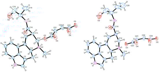 The maleate salt of ergometrine, compound 6, crystallized in the orthorhombic P212121 system, as previously reported in the literature [20], while the maleate salt of methylergometrine 7 crystallized in a different space group, namely the monoclinic P21 [14].