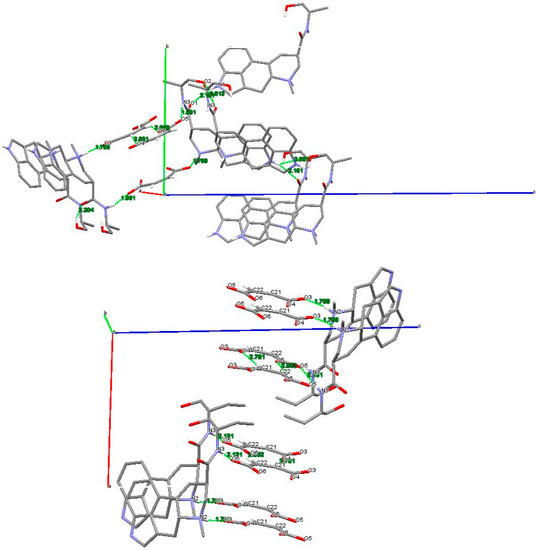 The crystal lattice of both structures is dominated by hydrogen bonds (Figure 5); in 6, in particular, the negatively charged carboxylate groups of the anions are engaged with a hydrogen belonging to the positively charged amino groups of the cations; moreover, bifurcated hydrogen bonds linking O1 with N1 and O2 of symmetry-related ergometrine molecules contribute to stabilize the crystals. In addition, Cπ-H···O contacts between neighboring anions give rise to the formation of molecular chains along the a-axis of the unit cell, further consolidating the crystal packing. In 7, we revealed some differences with respect to the previously reported structure [14]: in particular, the absence of the intermolecular interaction between the amidic oxygen and the NH of ring B and the presence of Cπ-H···O contacts between neighboring anions, which give rise to the formation of molecular chains along the b-axis of the unit cell.