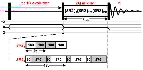 The combination of a SR scheme and an MQ-phase cycle yields a supercycle (SR)M that spans rotor periods. Herein, we employ either —which involves consecutive phase-shifts of [,,]—or that implies the sequence of phase shifts []. Consequently, if (for instance) SR2 is utilized in an ()3 supercycle, Equation (1) yields the following explicit pulse train: