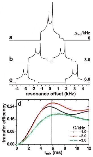 (a) Numerically simulated NMR spectra for a powder of two dipolar-coupled spins-3/2 at T and kHz MAS. The spin-system parameters in (a) correspond to those of two Na sites in NaSO, which were taken from ref. []: ; Hz; MHz; , except for the orientations of the three perpendicular dipolar and efg tensors, expressed by the respective Euler angles , , and . (b,c) As in (a), but for isotropic chemical shift differences of (b) kHz and (c) kHz. (d) Simulated magnetization transfer efficiencies—i.e., the fraction of longitudinal CT-magnetization of spin-site j transferred to spin k—for an increasing mixing period () of (SR2)4 dipolar-recoupling application. The curves were calculated for and resonance offsets , } kHz. The dotted line at ms marks the mixing period used to evaluate the results of Figure 3 and Figure 4 for the case of the (SR2)4 supercycle.