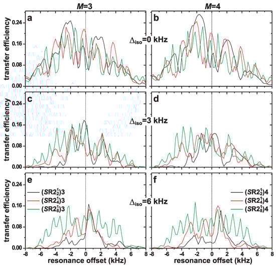 Numerically simulated magnetization-transfer efficiencies plotted against the resonance offset of the (SR2)M, (SR2)and (SR2)M sequences [identified in the legends of (e,f)] at T and 24.00 kHz MAS. The left and right panels display the results for and , respectively. All simulations employed a nominal CT nutation frequency during recoupling ( kHz) and the spin-system parameters of Figure 2 with isotropic chemical shift differences of (a,b) ; (c,d) kHz, and (e,f) kHz.