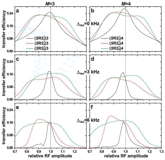 Figure 4 presents the evaluations of the robustness of each (SR2)M, (SR2)M, and (SR2)M recoupling scheme to rf-amplitude mis-settings from the nominal value . Using the conditions and parameters as in Figure 3, each magnetization-transfer efficiency curve was evaluated at the optimal resonance-offset value but with the (relative) nutation frequency of the CT varied. As for the resonance offset compensation, the results of Figure 4 reveal a progressively enhanced robustness to rf-amplitude errors along the series (SR2)M<(SR2)M<(SR2)M, whereas no significant differences are observed among each (SR)3 and (SR)4 scheme.