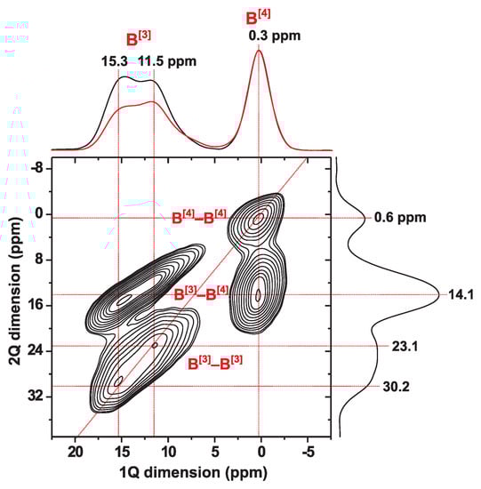 The NCBS glass structure consists of SiO and BO tetrahedra (B coordinations) along with planar BO (B coordination) groups, which are interlinked to form a borosilicate network [,]. This glass is nominally free from non-bridging oxygen (NBO; O) species, where NMR indicated 3% of NBO out of the O population []. Hence, essentially all of the Na and Ca cations balance the negative charges of the [BO] groups. In analogy with the [AlO] tetrahedra in crystalline and amorphous aluminosilicate phases [,,], the negatively charged [BO] moieties have generally been assumed not to form direct linkages (B–O–B) in borate/borosilicate glasses [,], disregarding B-rich borosilicate glass compositions for which B–O–B bridges cannot be avoided, owing to a high fractional population of the BO groups and/or a high NBO content of the glass; see Equation (1) of ref. []. Yet, recently Yu et al. [] provided unambiguous experimental evidence that B–O–B are abundant motifs in Na and mixed-Na/Ca based borosilicate glasses over large compositional spaces (we also note that aluminosilicate glasses comprising trivalent rare-earth ions revel an essentially random Al/Si intermixing that implies substantial amounts of Al–O–Al bridges [,]). The presence of B–O–B bonding was established by 2Q–1Q correlation B MAS NMR experiments using one completed [SR2] sequence for 2QC excitation [], such as that obtained from the NCBS glass and shown in Figure 5.