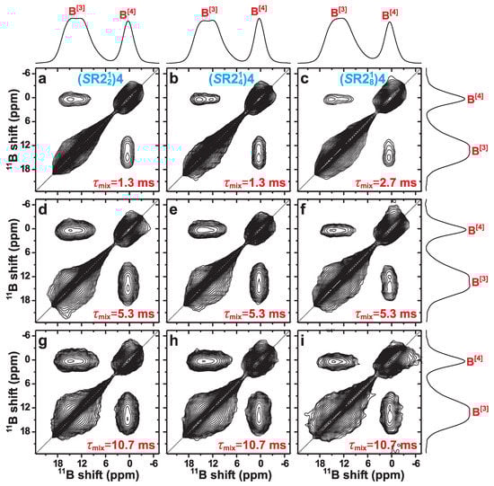 In the following, we consider the relative NMR-signal sensitivities (rather than the magnetization transfer efficiencies) offered by the various (SR)M and (SR)M dipolar recoupling schemes. Notably, the B NMR-signal intensities observed from the NCBS glass when employing the present (SR2)and (SR2)M sequences are markedly better then those of the windowed (SR)M recoupling options utilized by Edén et al. [] (see Section 2): relative to the integrated 2D NMR-signal intensity obtained from the (SR2)4 scheme in Figure 6g, only 41% and 6% was observed when applying the (SR)3 or (SR)4 sequences with (see Section 2) for a mixing period of ms, respectively (as obtained by recording a 1D NMR spectrum according to the protocol of Figure 1 with ; data not shown). Next considering the NMR-signal intensity obtained among the various (SR)Msequences and again monitoring the fractional intensity relative to the 2D NMR spectrum of Figure 6g, the set of {(SR2)4, (SR2)4, (SR2)4} schemes revealed a {100%, 57%, 28%} signal retention, respectively, whereas the corresponding numbers are {112%, 55%, 21%} when employing the {(SR2)3, (SR2)3, (SR2)3} supercycles (data not shown). Hence, except for the (SR2)M supercycles, the (SR)M, recoupling schemes offer markedly better S/N than the windowed (SR)M counterparts of ref. [].