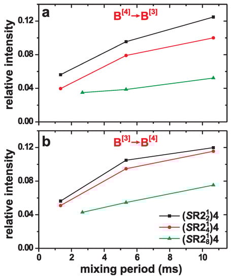 We conclude that while any (SR)4 dipolar recoupling sequence give unambiguous evidence for B–O–B linkages in the NCBS glass network for mixing intervals ms (Figure 6), the MQ-phase cycle based on the simplest SR2 scheme performed best. In the case of the NCBS glass, no advantages are offered by the more complex (SR2)4 and (SR2)4 supercycles, where the (SR2)4 option gives a significantly worse NMR-signal sensitivity and magnetization transfers as compared with (SR2)4 (see Figure 6 and Figure 7). Considering the simulation results of Figure 3, the experimentally observed relative merits of the three (SR)4 recoupling schemes are rather surprising. Yet, the chemical-shift separation between the B and B sites is relatively small ( ppm, i.e., kHz), where a good performance of SR2-based schemes are indeed reported in previous 2QF and 2Q–1Q correlation NMR evaluations for similar cases where resonance offsets are low or absent [,,,,,]. Experiments reveal that the (SR2)M and (SR2)M schemes give significantly better magnetization only for scenarios of (moderately) large chemical-shift differences, for which the (SR2)M counterparts perform poorly.