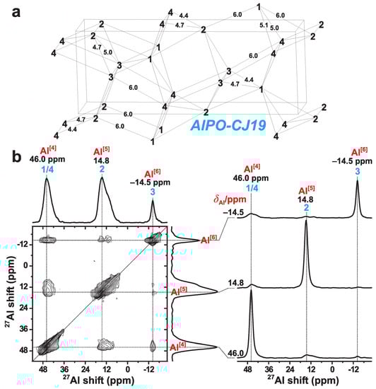 (a) Structural fragment of AlPO-CJ19 []. Only the four Al sites (Al1-Al4) are indicated, along with the shortest Alj–Alk interatomic distances (numbers in Å) among inequivalent sites (). All shortest Alj–Alj distances between equivalent sites () are around 5.1 Å. The Al1, Al2, Al3, and Al4 sites are identified with their respective Al, Al, and Al coordinations in the legend. (b) 1Q–1Q correlation Al MAS NMR spectrum recorded from AlPO-CJ19 ( T, kHz), using the (SR2)3 sequence for magnetization transfers during a mixing period of ms. Slices extracted at the as-indicated shifts along the vertical spectral dimensions are shown in the right panel.