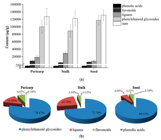 The established UFLC-QTRAP-MS/MS method was subsequently applied to the simultaneous determination of bioactive constituents in different segments of FF. Contents of the twenty-one analytes were summarized in Tables S3–S5. As shown in Figure 1, four types of compounds analyzed could be detected in all segments of the fruit and they showed high diversity in content in the same segment. To be specific, the contents of phenylethanoid glycosides, which accounted for 72.76% to 89.52% of the total content of investigated compounds, were the highest, followed by lignans and flavonoids, and the contents of phenolic acids stayed at a low level. Moreover, it could be found that the phytochemical profiles among different segments were similar.