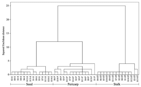 Additionally, the hierarchical cluster analysis, using the Ward’s method with Squared Euclidean distance as the similarity measurement was modeled to cluster the different groups according to the quantification of compounds analyzed. Figure 2 presents the resulting dendrogram. It could be found that samples from the same segment could be grouped into one cluster. Based on this, the “seed” samples and “pericarp” samples were initially clustered into one group and then clustered with “stalk” samples. When the dendrogram was cut with a horizontal line at the distance of 5, the samples could be classified into three categories, i.e., “seed” samples in a category, “pericarp” samples in a second category, and “stalk” samples in a third category.