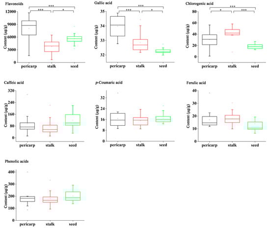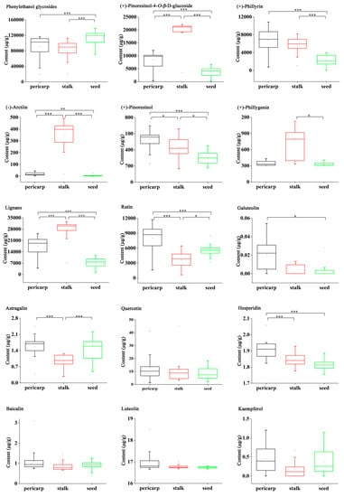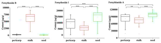 One-way ANOVA was further performed on the mean contents of twenty-one analytes in order to verify the abundance difference of various fruit segments. The significance threshold was lowered to p < 0.005 and 0.005 < p < 0.05 was defined as “suggestive evidence” to reduce the false positive rate []. The results indicated significant difference among the “pericarp”, “stalk” and “seed” samples with four-sevenths of compounds displaying significant differences (p < 0.005). Additionally, the distribution characteristics of single-component were similar to that of the total same type component, except for forsythoside B and gallic acid, which were with particular abundance in stalk and pericarp, respectively. Generally, phenylethanoid glycosides were highly expressed in the seed; lignans were primarily enriched in the stalk, flavonoids were largely concentrated in the pericarp, whilst the contents of phenolic acids showed not much difference among various segments.