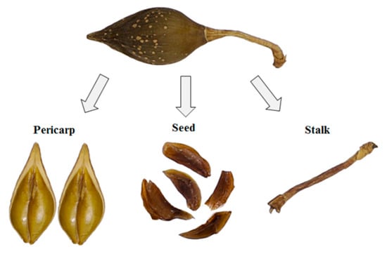 The plant materials were collected from the major producing areas of FF, including Shanxi, Shaanxi, and Henan provinces. Table 3 showed the detailed geographical origins for each sample. All of them were authenticated as Forsythiae Fructus (Qingqiao) by Prof. Xunhong Liu, School of Pharmacy, Nanjing University of Chinese Medicine, PR China. The voucher specimens were deposited at the identification laboratory of Nanjing University of Chinese Medicine. Subsequently, each of them was divided into three segments: pericarp, stalk, and seed (Figure 4).