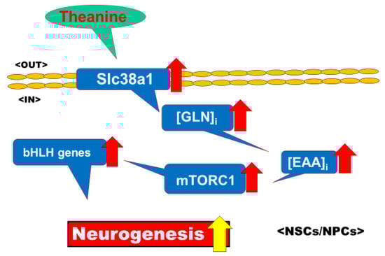Sustained exposure to theanine would lead to selective upregulation of Slc38a1 expression toward the increased intracellular GLN level, followed by facilitated incorporation of extracellular EAAs in exchange of intracellular GLN in primitive NSCs/NPCs only, but not in daughter cells such as neurons and astrocytes. Resultant increased EAA levels could activate mTORC1 phosphorylation signaling to upregulation of several bHLH transcription factors capable of promoting neurogenesis in NSCs/NPCs, as summarized in Figure 1. In neurons, by contrast, theanine should suppress the replenishment of neurotransmitter pools of inhibitory GABA as well as excitatory Glu through a mechanism relevant to inhibition of the incorporation mediated by different isoforms of GLNT of extracellular GLN. The latter action could at least in part account for the improvement of sleep disturbance after acute theanine intake in humans, while the former action would be related to the usefulness for the preservation of brain wellness after chronic theanine ingestion in a particular situation. Both actions seem to be commonly mediated by the inhibition of GLN transport by theanine. The exact molecular mechanism underlying the selective upregulation of Slc38a1 expression by theanine in primitive NPCs/NSCs only, however, still remains to be elucidated in future studies.