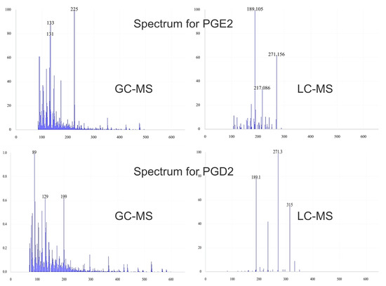 Representative mass spectra of prostaglandin E2 (PGE2) and prostaglandin D2 (PGD2) obtained by using hard (gas chromatography–mass spectrometry (GC–MS)) and soft ionization (liquid chromatography–mass spectrometry (LC–MS)/MS) in spectrometry mass.