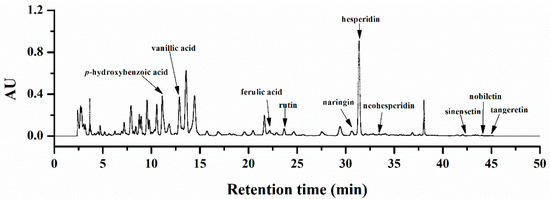 Eleven compounds, including seven flavonoids and four phenolic acids, were identified in the high-performance liquid chromatography (HPLC) profile of orange extracts (Figure 1). Hesperidin was the predominant phenolic compound (50.05 ± 10.18 μg/g FW), followed by vanillic acids, p-hydroxybenzoic acid, and rutin. Several characteristic citrus flavones, such as nobiletin, naringin, tangeretin, neohesperidin, and sinensetin, were also observed in the orange extracts.