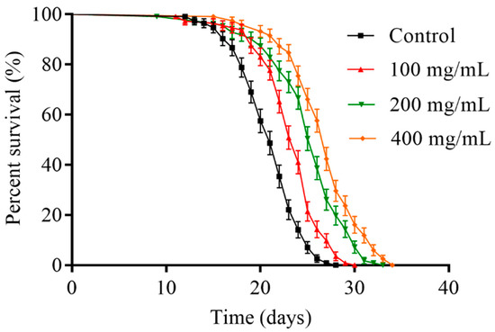 Effect of orange extracts on the lifespan of N2 wild-type C. elegans. Day 1 adult nematodes at the L4 stage (fourth larval stages) were treated with and without orange extracts (0, 100, 200, or 400 mg/mL) at 20 °C. The survival was counted starting from day 1 of adulthood to death. Supplementation with orange extracts significantly increased the survival rate of nematodes compared to those not treated with orange extracts (control). The experiment was performed in triplicate.