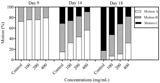 A series of physiological representations, including movement behavior, body length, and age pigment, were used as aging-associated indicators to assess the healthspan of C. elegans. The motility characteristics of nematodes treated with orange extracts were evaluated at early, moderate, and late life stages (on day 9, 14, and 18), respectively (Figure 4). Obviously, when worms were in an early stage of the life process (on the ninth day), over 70% of the animals were still assessed as motion A worms regardless of whether the worms were fed the with or without orange extracts. On day 14, the motion A animals decreased significantly whereas motion B and motion C worms increased dramatically when compared with the situation on day 9. Notably, the proportion of motion A ascended with the increasing concentrations of orange extract treatments (32%, 44%, and 56% in the 100, 200, and 400 mg/mL group, respectively). By day 18, the orange extract-fed worms still exhibited better movement capacity in a dose-dependent manner compared with the control group, such that 32% of the animals treated with 400 mg/mL of orange extracts still moved spontaneously (motion A) while 83% of the control were assessed as motion C. Overall, the orange extract treatment potently improved the movement behavior of C. elegans in a dose-dependent manner.