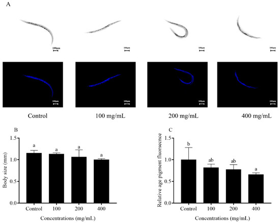 Effect of orange extracts on body size and age pigment accumulation in C. elegans. Wild-type N2 animals were treated without or with 100, 200, and 400 mg/mL orange extracts for 5 days at 20 °C. (A) Representative pictures of the body size and age pigment accumulation of N2 worms. Body size (B) and relative fluorescence of the age pigment (C) were quantitated by Image J software. Bars with different letters indicate statistical significance (p < 0.05, mean ± SD, n = 3).