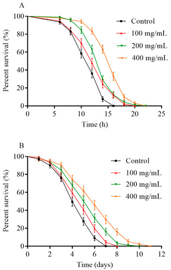 Effect of pretreatment with orange extracts on resistance to stress in N2 wild-type C. elegans. Nematodes were treated with various concentrations of orange extract (0, 100, 200, 400 mg/mL) as young adults for 5 days at 20 °C and then exposed to different stressors: (A) 35 °C thermal shock (N ≥ 95). (B) UV-B radiation at 120 mJ/cm2 (N ≥ 92). The experiment was performed in triplicate.