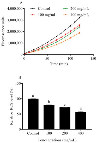 Oxidative stress induced by ROS accumulation is a major factor limiting the lifespan of C. elegans [12]. Reducing the overproduction of intracellular ROS exerts a positive impact on oxidative stress resistance. In our study, the levels of ROS in N2 C. elegans were determined by the ROS indicator Dichlorofluorescin-diacetate (DCFH-DA). DCFH-DA, as a membrane-permeable molecule without fluorescence, is oxidized into fluorescent 2′,7′-dichlorofluorescein (DCF) in the presence of intracellular ROS, thus the levels of intracellular ROS can be determined by monitoring the variation of the fluorescent intensity of DCF. As Figure 7 illustrated, 5-day pre-treatment with orange extract significantly reduced ROS at all concentrations. The ROS levels were respectively reduced by 20.5%, 28.4%, and 43.3% among orange extract-treated groups at 100, 200, and 400 mg/mL compared with the control nematodes. The results indicated that supplementation with orange extracts inhibited intracellular ROS formation in wild-type nematodes in a dose-dependent manner.