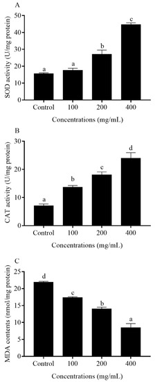 The effect of orange extracts on the activities of SOD and CAT and the contents of MDA were analyzed from orange extract-treated C. elegans (Figure 8). After 5-day exposure to orange extracts, the 200 and 400 mg/mL orange extract-treated groups led to a 1.7- and 2.9-fold increment in SOD activity compared with the control worms. The 100 mg/mL group slightly increased SOD activities (1.1-fold) compared with the control. Compared with the control, the CAT activities of the 100, 200, and 400 mg/mL orange extract-treated groups also increased by 0.9-fold (100 mg/mL, p < 0.05), 1.4-fold (200 mg/mL, p < 0.05), and 2.2-fold (400 mg/mL, p < 0.05), respectively. Therefore, the abilities of orange extracts to scavenge for O2− and H2O2 could be found in C. elegans. The generation of MDA is a mark of oxidative damage of an organism. Since orange extracts were able to promote oxidative stress resistance in nematodes, we determined the MDA levels in the N2 C. elegans strain. The MDA contents were 20.7% to 61.1% lower in the orange extract-treated groups than those in the control group. The findings indicated that orange extracts played a crucial role in reducing the end product of lipid peroxidation (MDA) of aged worms.