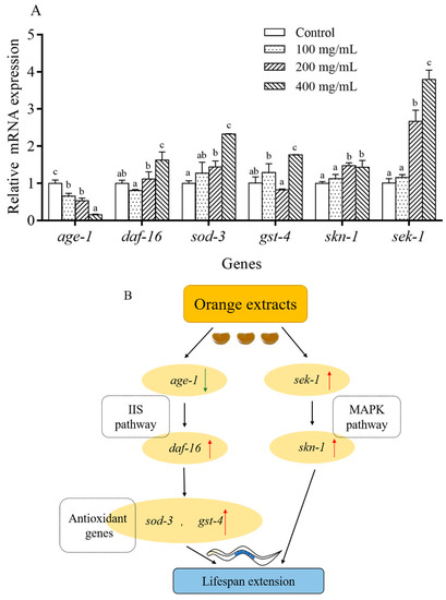 The results above indicated that orange extract effectively mediated the extension of the worms’ lifespan. To unravel the mechanism of this effect at the transcription level, we measured the relative expression levels of stress resistance and longevity-related genes, including age-1 (Phosphatidylinositol 3-kinase age-1), daf-16 (Fork-head domain-containing protein), sod-3 (Superoxide dismutase [Mn] 2), gst-4 (Glutathione S-transferase 4), sek-1 (Dual specificity mitogen-activated protein kinase kinase sek-1), and skn-1 (BZIP domain-containing protein), through quantitative Real-time PCR (RT-PCR) (Figure 9A). The expression levels of some key genes (age-1, daf-16, sod-3, and gst-4) in the IIS pathway, which is an evolutionarily conserved pathway involved in regulating the lifespan, stress resistance, and ROS formation in C. elegans, were determined. The orange extract treatment upregulated the relative expression levels of daf-16 by 0.81 to 1.63-fold but downregulated age-1 by 0.65-fold to 0.16-fold at different concentrations compared with the control. The expression levels of the downstream target genes sod-3 and gst-4 ranged from 1.28- to 2.32-fold and from 1.30- to 1.77-fold at different doses of orange extract, respectively. The mRNA expression of sek-1 and skn-1 in the MAPK pathway, which plays a crucial role in stress resistance and lifespan regulation in C. elegans, was also analyzed in our study. We found that orange extracts dramatically elevated the expression of skn-1, ranging from 1.13- to 1.44-fold, and sek-1, ranging from 1.16- to 3.79-fold. These results showed that orange extract treatment increased the expression levels of daf-16, sod-3, gst-4, sek-1, and skn-1 and suppressed age-1 expression.