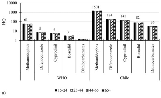 The HQs are described for both models in all age groups. The HQs for all the pesticides residues detected were compared in both models. Vegetables with a HQ greater than 100% are considered potentially unsafe for consumption [33]. For the Chilean model, all the detected HQs were higher than the WHO model.