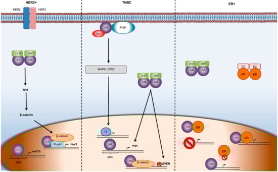 Mechanisms of AR mediated gene transcription in different subtypes of breast cancer. In ER-α-negative/HER 2-positive breast cancer, the Wnt/β-catenin pathway is implicated and facilitates the transcriptional activity of AR promoting tumor growth. In TNBC, androgens seem to initiate second-messenger signaling cascades, which often results in a feedback loop, leading to the progression of the tumor. In the ER-positive, BC subtype, there is a dynamic relationship between ER and AR, where the two receptors can transcriptionally regulate each other through heterodimerization and binding to the same DNA sequence. Abbreviations: AR—androgen receptor; ARE—androgen receptor element; DHT—dihydrotestosterone; TF—transcription factor.