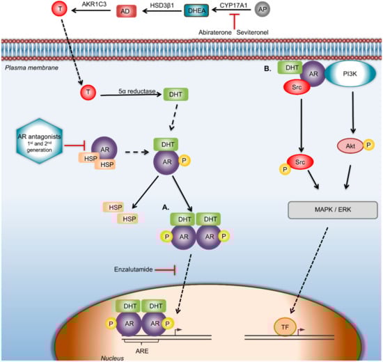 The Androgen Receptor (AR) is a type I nuclear receptor. In the absence of a ligand, it is located in the cytoplasm associated with heat shock proteins (HSP) and other chaperons. Once circulating androgens passively diffuse through the cell membrane, they bind to AR causing conformational changes. Subsequently, AR disassociates from heat shock proteins, gets activated, and forms dimers. These dimers translocate to the nucleus, binding to androgen-responsive elements (AREs) within target genes, causing modulations in DNA transcription. AR dimers can regulate gene transcription positively or negatively, leading to differentiation, proliferation, apoptosis, or angiogenesis [] (Figure 2). AR can also be activated in a ligand-independent manner through cross-talk with key signaling pathways, including PI3K/Akt, ERK, mammalian target of rapamycin (mTOR) and Wnt/β-catenin, or through interaction with other proteins such as Forkhead box Protein A1 (FOXA1) (Figure 1). Non-ERK-mediated AR signaling also involves forkhead box protein O1 (FOXO1) inactivation and protein kinase A (PKA) activation [,].