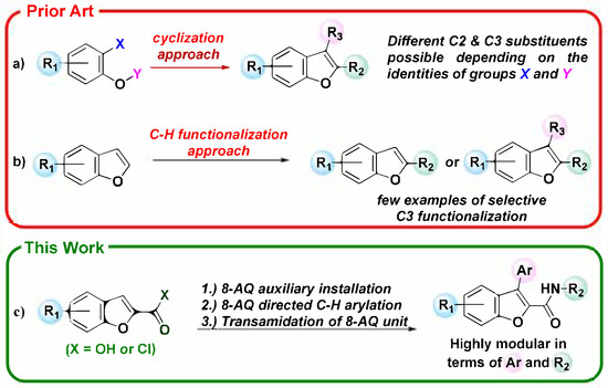 The benzofuran scaffold is a heterocyclic motif that consists of a fused benzene and furan ring, and many different synthetic strategies have been used in the past to introduce substituents on these two parts (Scheme 1a,b) [8,9,10]. Substituents at the benzene moiety often originate from the synthetic precursor used to construct the benzofuran scaffold. Synthetic methods for assembling the benzofuran scaffold have typically involved acid-catalyzed cyclizations [11,12,13,14,15,16,17], carbonylative cyclizations via Sonogashira reactions [18,19,20,21,22,23,24], Heck-type cyclizations [25,26,27,28,29], photocyclizations [30,31,32,33,34], radical cyclizations [35,36,37,38,39], and other types of transition-metal catalyzed transformations [40,41,42,43,44,45]. When it comes to the functionalization of the furan part, there exists a considerable number of methods for directly functionalizing either the C2 or C3 position [46,47,48,49,50,51,52,53,54,55,56]. Of these two positions, C2 is generally easier to functionalize as it is significantly more reactive than C3 [57,58].