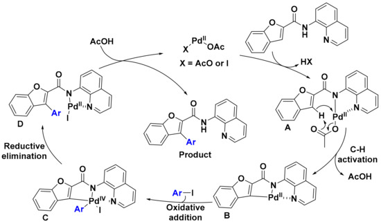 Regarding the mechanism of the C–H arylation of these benzofuran derivatives, it is proposed to proceed via a Pd(II)/Pd(IV) cycle similar to those of other previously reported 8-AQ-directed C–H functionalization reactions (Scheme 4) [60,61,62,84]. The catalytic cycle begins with coordination of Pd(OAc)2 to the substrate, which leads to the formation of intermediate A and the liberation of HX (where X = OAc or I). In the next step, C–H activation occurs concomitantly with the release of AcOH to give the palladacycle B. This is followed by oxidative addition of the aryl iodide to B, which furnishes the Pd(IV)-intermediate C that, then, undergoes reductive elimination to form the arylation product-bound Pd(II)-complex D. Finally, the catalytic cycle is closed by a protodemetalation process triggered by AcOH, which leads to the release of the C–H arylation product and the regeneration of an active Pd catalyst.