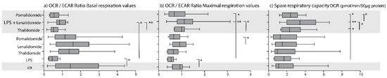 Analysis of monocyte metabolism using the XF Mito Stress Test assay and the Seahorse XF 96 cell analyzer; a summary of the overall results. Normal monocytes were cultured in medium alone or in the presence of LPS (lipopolysaccharide) 1 ng/mL, or IMiDs (immunomodulatory drugs) 5 μg/mL for four hours before the oxygen consumption rate (OCR) and extracellular acidification rate (ECAR) were determined. Each of the figures presents the OCR:ECAR ratio (diagrams (a,b)) or the spare respiratory capacity (diagram (c)) for cultures prepared in (from the bottom to the top of each diagram) (i) medium alone (ctr), (ii) LPS control, (iii) each of the IMiDs—thalidomide, lenalidomide, or pomalidomide—in medium alone without LPS; and (iv) LPS in combination with either thalidomide, lenalidomide or pomalidomide. The figures show the results for (a) the OCR:ECAR ratio during the initial period of basal incubation; (b) the period of maximal respiration after addition of FCCP (Carbonyl cyanide-4 (trifluoromethoxy) phenylhydrazone; an uncoupling agent); and (c) the calculated spare respiratory capacity. The figure summarizes the results for 10 independent experiments testing monocytes from 10 healthy blood donors. The results are presented as median, box (i.e., the 25–75 percentiles) and whiskers (the 5–95 percentiles). The Wilcoxon test for paired samples was used for the statistical comparisons, and p-values < 0.05 were regarded as statistically significant. The significant comparisons are indicated in the figure (* p < 0.05, ** p < 0.01).