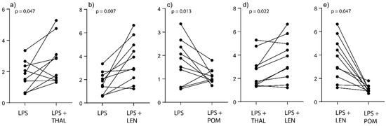 Thalidomide was tested at a concentration corresponding to its therapeutic serum level (i.e., 5 μg/mL) in the previous experiments, whereas lenalidomide and pomalidomide in vivo levels are lower than this. We therefore tested the effect of lenalidomide 500 ng/mL and pomalidomide 100 ng/mL on the TLR4/LPS-induced mediator release for five healthy donors, and both these IMiDs could inhibit soluble mediator release even when tested at the lower concentrations corresponding to their serum levels (uncorrected p-value of 0.031, Wilcoxon test for paired samples).