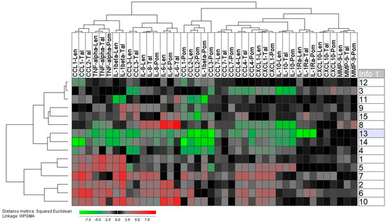 We also did a hierarchical clustering analysis including all the drugs and all the mediators (Figure 5). This analysis was based on the relative mediator levels in drug-containing cultures, i.e., levels in IMiD cultures relative to the level in the corresponding LPS control culture. Each of these relative responses for a mediator was next normalized to the median relative response for all three IMiDs, i.e., the median relative response of the 45 IMID responses for each soluble mediator (3 drugs times 15 individuals). It can be seen that even for mediators showing highly significant overall effects of IMiDs there was a considerable variation among individuals with regard to the effect.