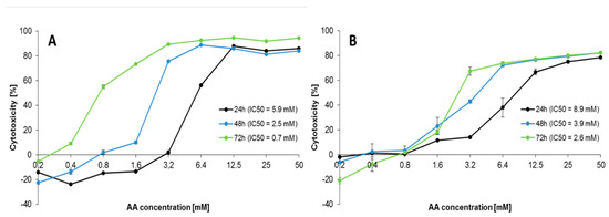 Treatment of Caco-2 cells with AA (0.2–50 mM) resulted in a time- and dose-dependent decrease in cell viability, as measured by both MTT and PrestoBlue assays after 24–72 h (Tables S1 and S2, Supplementary Materials). Statistics for MTT and PrestoBlue assays are presented in Tables S1 and S2. Both assays showed that different concentrations of AA treatment significantly decreased Caco-2 cell proliferation at 24–72 h when compared with the AA unexposed negative control (p < 0.05). The correlations between the AA concentration and cell proliferation were presented in Figure 1A,B. In the presence of the highest AA concentration (50 mM), cytotoxicity exceeded 84.0%–94.4% and 78.4%–82.2% after 24–72 h exposure in MTT and PrestoBlue assays, respectively. Exposure to 6.4–50 mM of AA (24 h), 3.2–50 mM of AA (48 h), and 0.8–50 mM of AA (72 h) showed a significant increase in AA cytotoxicity in the MTT assay, while in the PrestoBlue assay, AA induced cytotoxic effects from 6.4–50 mM of AA (24 h) and 1.6–50 mM of AA (48–72 h) (p < 0.05). The inhibitory concentration (IC)50 values after 24–72 h of exposure to AA showed higher cytotoxicity in the MTT assay (5.9, 2.5, and 0.7 mM) than PrestoBlue assay (8.9, 3.9, and 2.6 mM), respectively. Different values obtained for each of the assay types resulted from the diverse molecular mechanism used by them. Despite the fact that they are used for quantitative measurements of products generated by mitochondrial and cytosol dehydrogenases, the different structures of the substrates strongly determined the region the reaction occurred and the assay sensitivities [21]. MTT is reduced inside the cells to insoluble formazan, while the resazurin-based PrestoBlue reagent present in the culture medium can be reduced by mitochondrial reductases and other cellular enzymes. In contrast to the resazurin-based reduction signifying a disturbance of cellular metabolism, the tetrazolium–salt substrate also reacts when interruption to electron transport and mitochondrial dysfunction occurs. Thus, the higher sensitivity of MTT may result from AA influence on cellular mitochondria, causing an additional positive effect to the disturbed metabolism in cells. Despite this, our results are in accordance with another study performed with metabolic activity-based assays, however, owing to the fact that the different cellular models and tissue origins influenced the different sensitivities of used cells to AA, the IC50 values also varied. Chen et al. [18], in their study on the inhibition of AA cytotoxicity on Caco-2 cells in MTT assay by myricitrin—a naturally occurring flavonoid derived from Chinese bayberry bark and fruit—demonstrated an IC50 value of AA close to 5 mM after 48 h exposure. The IC50 of AA for 24 h exposure of NIH/3T3 fibroblasts was 6.73 mM as estimated by MTT assay [22]. For the adenocarcinoma alveolar-basal epithelial cells A549, the IC50 after 24 h was 4.6 mM [23], and for the normal human lung epithelial cells BEAS-2B, it was 2.0 mM [24]. The cytotoxic and antiproliferative activity of AA was demonstrated by some authors for several cancer and normal cell lines (e.g., human neuroblastoma SH-SY5Y; human astrocytoma U-1240 MG; neural progenitor cell line C17.2; murine microglial cell line BV2; A549; NIH/3T3 fibroblasts; cervical cancer HeLa [22,23,24,25,26,27,28]). According to Kacar et al. [24], AA interferes with kinesin proteins, which are responsible for the spindle formation during cell division, thus inhibiting cell proliferation. Mechanisms of AA toxicity were the subject of profound reviews [14,29]. In the subsequent analysis, we wanted to detect mechanisms of AA toxicity in the Caco-2 cell line. The obtained data allowed as to choose appropriate concentrations of AA for further investigations.
