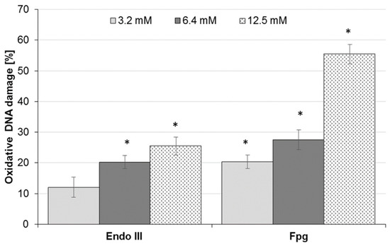 In order to understand the mechanism involved in DNA damage, a comet assay was also performed in Caco-2 cells exposed to AA in the presence of repair enzymes, endonuclease III (Endo III), which detects oxidized pyrimidines, and Fpg, which recognizes the common oxidized purine 8-OHgua (7,8-dihydro-8-oxo-guanine). The model of the research has not yet been published for Caco-2 cells. The greatest extent of DNA oxidation was recognized by Fpg for cells treated with 12.5 mM AA, calculated as 55.4% ± 3.1% (p < 0.05) (Figure 3). For the positive control treated with 50 µM H2O2, the oxidative DNA damage was equal to 51.8% ± 3.5% and 49.4% ± 3.6%, as recognized by Endo III and Fpg, respectively (data not shown). Non-exposed Caco-2 cells (negative control) exhibited little DNA damage, at 0.7% ± 2.1% and 0.8% ± 2.5% for Endo III and Fpg, respectively (data not shown). The results revealed an increase in oxidative DNA damage in Caco-2 cells treated with AA in a dose-dependent manner, yielding between 12.1% ± 3.3% and 25.4% ± 3.0%, and between 20.4% ± 2.2% and 55.4% ± 3.1%, for Endo III and Fpg enzymes, respectively (Figure 3). Overall, the oxidative damage recognized by Fpg was greater than by Endo III across all AA concentrations. Moreover, for 12.5 mM AA, the percentage of detected oxidative damage was more than two times higher for oxidized purine 8-OHgua by Fpg of 55.4% ± 3.1% than for oxidized pyrimidines by Endo III of 25.4% ± 3.0%.