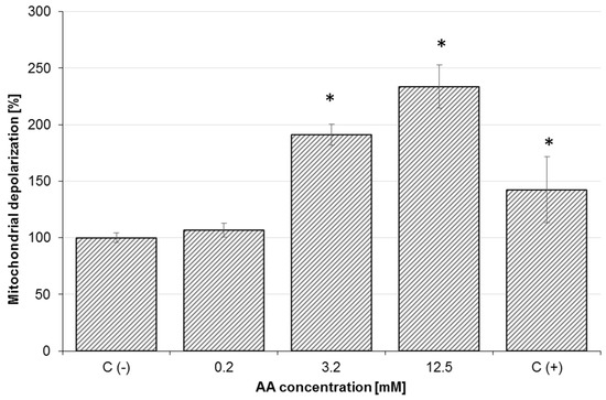 The JC-10 (lipophilic dye) used in that assay forms reversible red-fluorescent in the mitochondria of cells with a polarized mitochondrial membrane. In apoptotic cells, MMP collapse results in the failure to retain JC-10 in the mitochondria, and a return of the dye to its monomeric, green fluorescent form determines the loss of MMP in cells. This test can be used for monitoring apoptosis and for screening apoptosis inhibitors and activators. An MMP assay was performed according to manufacturer’s instruction with minor modifications. For the experiment, 2 × 104 Caco-2 cells were seeded in each well of a 96-well black plate in a complete culture medium. The cells were incubated overnight at 37 °C under 5% CO2. Next, the medium was aspirated and AA in DMEM was added to each well in four repeats and incubated at 37 °C under 5% CO2 for 24 h. The final AA concentrations were 0.2, 3.2, 6.4, and 12.5 mM. The negative controls contained only cells in DMEM without AA, while positive controls contained cells in DMEM with 50 µM CCCP. Fluorescence was measured at λex 490/ λem 525 nm. The average green fluorescence was determined as [%] of the negative control, which was assumed to be 100%.