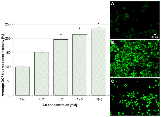ROS generation test was performed according to Wu et al. [53]. For the experiment, 2 × 104 Caco-2 cells were seeded in each well of a 96-well black plate in a complete culture medium (for microscopic observations, it was cultured in eight-well Lab-Tek™ Chamber Slides). The cells were incubated overnight at 37 °C under 5% CO2. The following day, the medium was aspirated, and cells were washed with PBS. Next, 20 µM DCFH-DA was added to each well. Cells were incubated at 37 °C under 5% CO2 for 30 min. After incubation, DCFH-DA was aspirated and cells washed with PBS and AA in DMEM (without FBS) was added to each well (in five repeats) to final concentrations of 0.2, 3.2, and 12.5 mM. The negative controls contained cells in DMEM (without FBS), while positive controls contained cells in DMEM (without FBS) with H2O2 (500 µM). Cells were incubated at 37 °C under 5% CO2 for 6 h. Fluorescence was measured at λex 490 and λem 530 nm. The average DCF fluorescence was determined as [%] of negative control, which was assumed to be 100%. The intracellular fluorescence of cells was observed under fluorescence microscope (Nikon Eclipse Ci H600L, Tokyo, Japan) attached to a digital camera (Nikon Digital Sight DS-U3, Tokyo, Japan) and an imaging software (NIS-elements BR 3.0, Nikon, Tokyo, Japan) at 200× magnification. An increased intensity of intracellular fluorescence was indicative of an increased level of generated ROS.