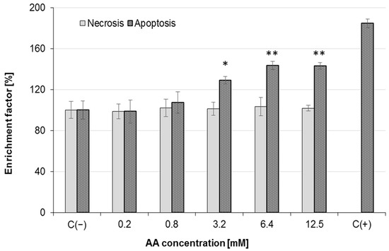 Apoptosis was measured by cell death detection ELISAPLUS according to the manufacturer’s instruction. That assay allows quantitative measurement of low molecular weight DNA level that appears after genomic DNA fragmentation catalyzed by endonucleases. The calculated enrichment factor corresponds to mono- and oligonucleosomes present in the cytoplasm fraction at a late stage of apoptosis. Cells were incubated for 24 h with AA final concentrations (0.2, 0.8, 3.2, 6.4, and 12.5 mM). After treatment, cells were lysed and histone-complexed DNA fragments (mono- and oligonucleosomes) present in the cytoplasmic fraction were quantified via an immunoreagent complex. DNA-histone complexes served as the positive control (PC) of apoptosis. Following incubation and washes, the colorimetric solution was added and, after adding the stop solution, the colorimetric signal was measured at 405 and 490 nm. Calculation of the enrichment factor of mono- and oligonucleosomes released into the cytoplasm was performed according to the following formula: